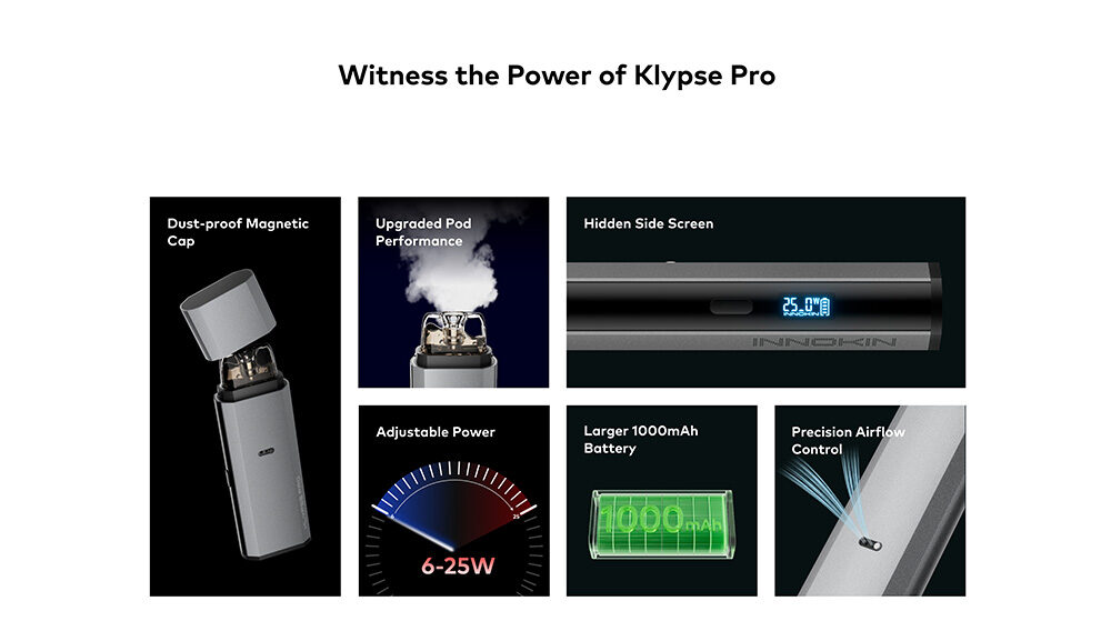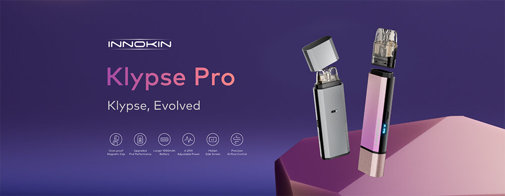 Ανακαλύψτε το Klypse Pro – Η απόλυτη αναβάθμιση στο άτμισμα. Με μεγαλύτερη μπαταρία 1000 mAh, ρυθμιζόμενη ισχύ 25 W και ακριβή ρύθμιση ροής αέρα, το Klypse Pro σας δίνει περισσότερο έλεγχο από ποτέ.